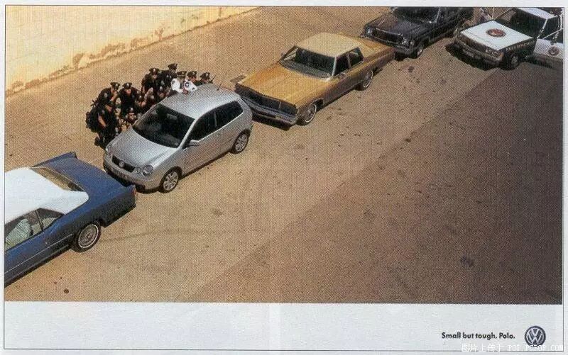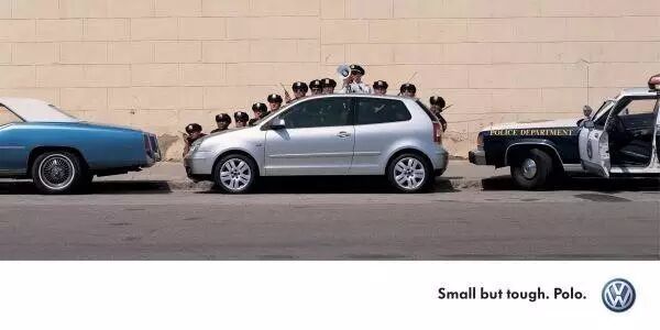 大众 Polo曾经有过这样一张创意广告:一群警察躲在一辆大众Polo后面(向犯罪分子)喊话。