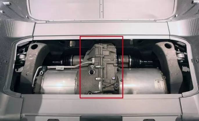 然而,特斯拉Model S并没有LSD。别急,请看特斯拉的底盘结构——电动机在后轴,红色框里面是主减速齿轮和差速器,跟普通汽油后驱车的差速器和传动轴基弧一样的。